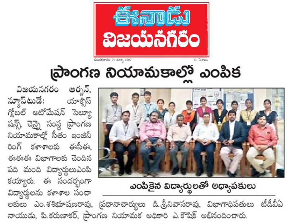 Eenadu press coverage on Axis Gloabl Campus placement drive held at SITAM on 18/03/2017.Click here to view details
